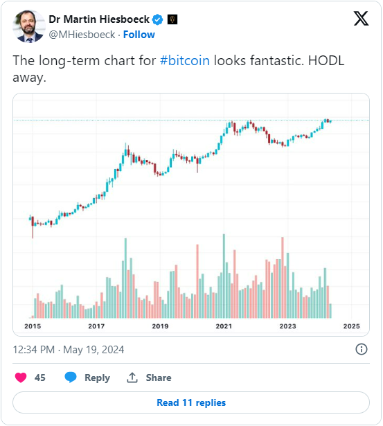 Dr Martin Hiesboeck, Head of Research at Uphold shared his long term bullish take on Bitcoin in a recent tweet on X.