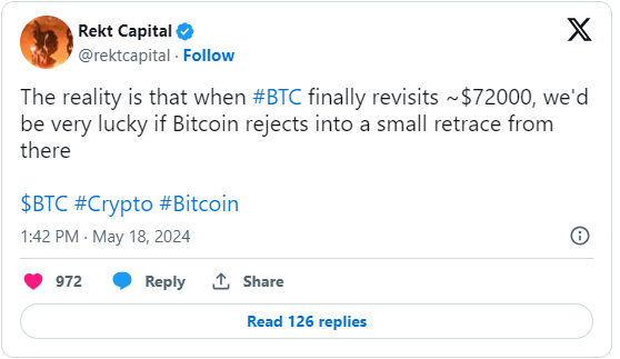 Crypto analyst Rekt Capital tweeted earlier on Sunday that “we would be very lucky” if BTC retraces after reaching $72,000.
