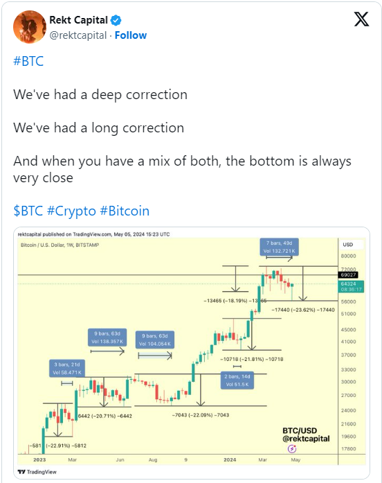 Bitcoin has secured support at $65,000 and as the asset marches ahead, analysts evaluate the likelihood of a deeper correction in Bitcoin. Crypto trader and analyst Yoddha told his 49,000 followers on X that Bitcoin is holding up strongly and said, “I don’t think there will be a deep correction.”