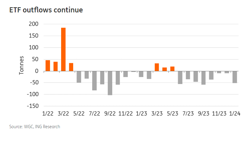 Fed Chair Jerome Powell reiterated this week that it will likely be appropriate to begin to lower borrowing costs “at some point this year”, but also said that the central bank wants more confidence that inflation is moving sustainably toward 2%. Lower rates are typically positive for gold, which doesn’t offer any interest.